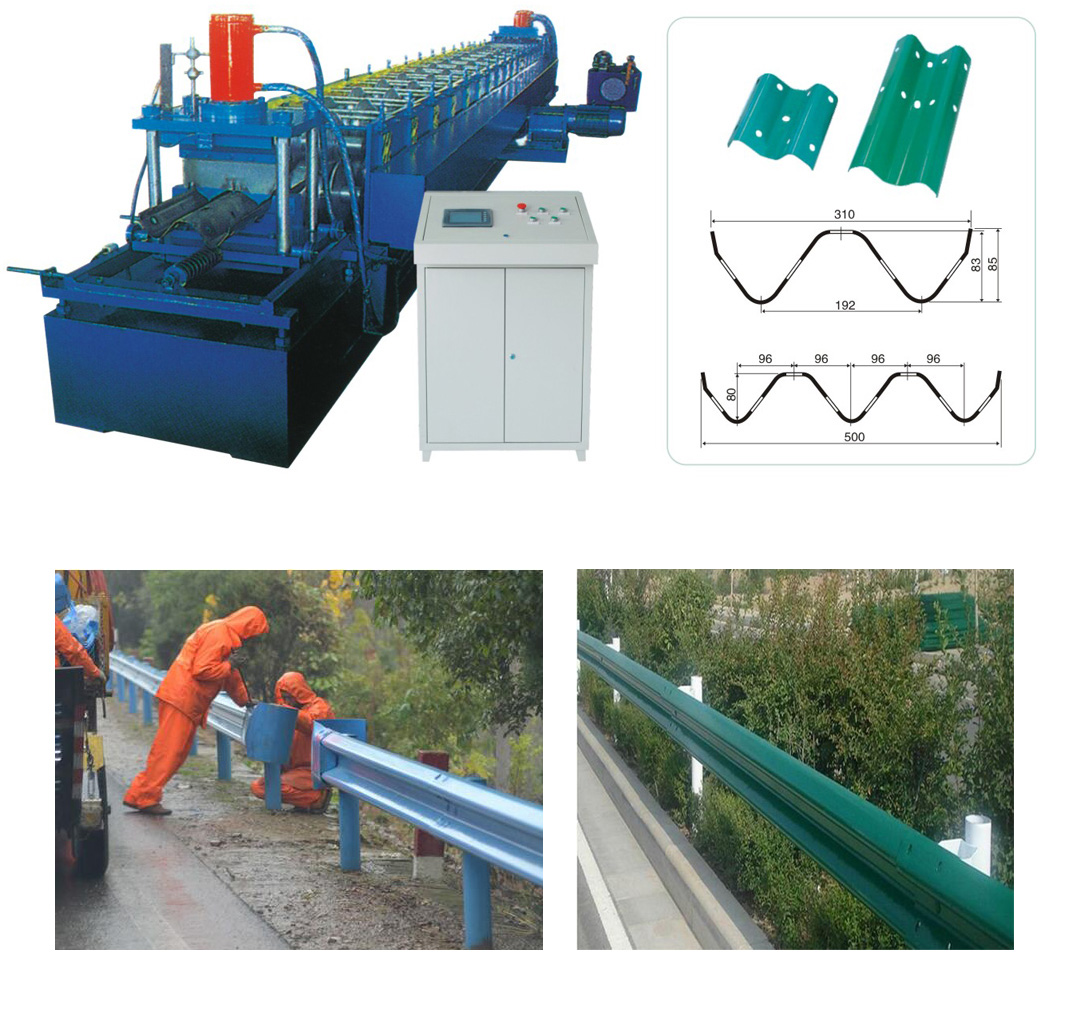 350型高速護欄板成型壓瓦機主要由開卷機、校平機、沖孔機、沖中孔機、成型主機、成型剪切裝置、液壓站、電腦控制系統(tǒng)、成品托架等幾部分組成。
