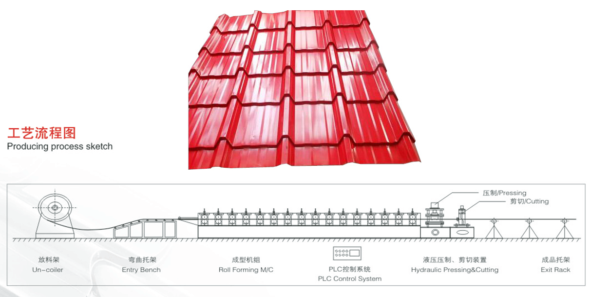 彩鋼琉璃瓦設(shè)備主要由放料機、進料導入平臺、成型主機、沖模壓型裝置、成型剪切裝置、液壓站、電腦控制系統(tǒng)、成品托架等幾部分組成。